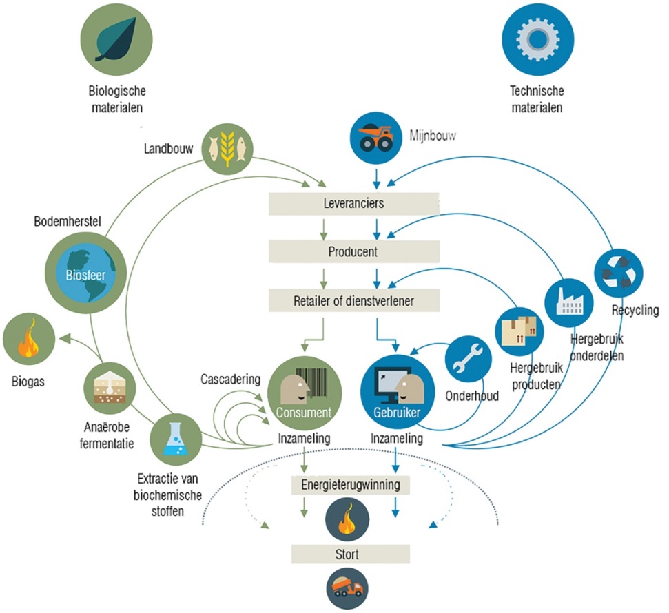In de circulaire economie wordt onderscheid gemaakt tussen een biologische kringloop en een technische kringloop (zie figuur 1). De producten gemaakt in de technische kringloop zullen in het ideale geval vanaf de oorsprong ontworpen moeten zijn voor een zo geavanceerd mogelijke vorm van hergebruik. De biologische kringloop (bio-economie) gaat er van uit dat biomassa en biologische reststromen via een cascade van processen zo hoog mogelijk worden verwaard.